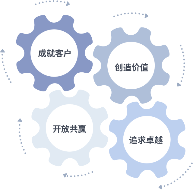 成就客户是一切决策的出发点,,,,创造价值是衡量所有工作的标准,,,追求卓越是我们做事做人的态度,,开放共赢是我们的格局也是最终的结果。。价值观的齿轮环环相扣,,,,推动着组织里的每个人不断向前。。
